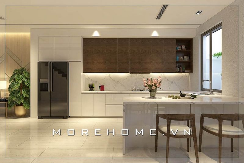Thiết kế nội thất phòng bếp hiện đại sử dụng tone màu nâu - trắng tạo điểm nhấn, hài hòa với không gian nhà biệt thự