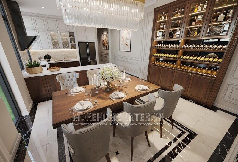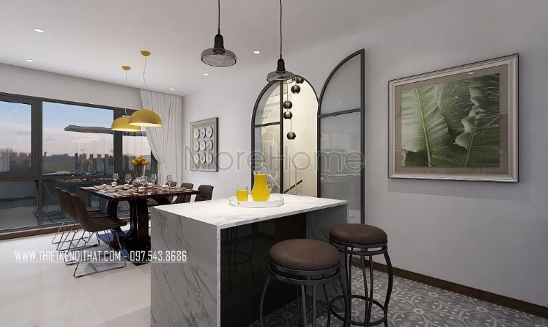 Trang trí nội thất phòng ăn ấn tượng ấn tượng với tone màu tương phản cao mang lại nét sang trọng độc đáo
