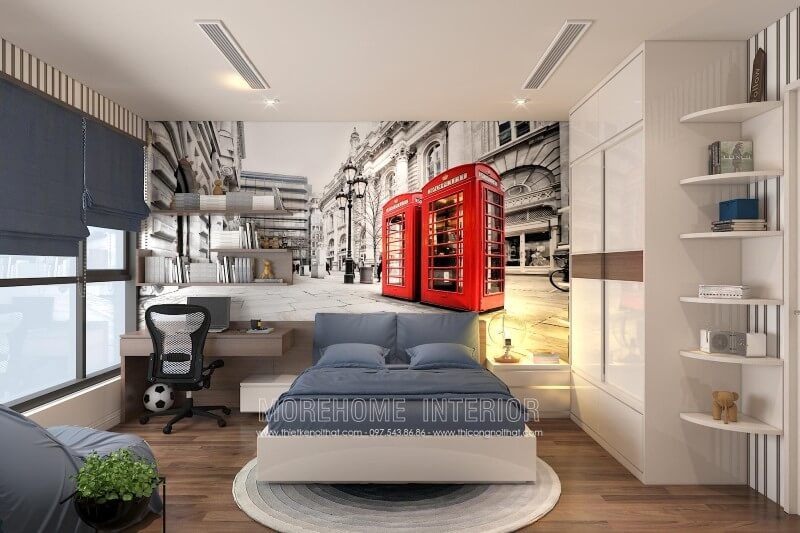 Giường ngủ gỗ hộp kiểu dáng thấp, gam màu trắng trẻ trung được bố trí chính giữa tạo sự sang trọng, thông thoáng hơn, giúp con có một không gian nghỉ ngơi và học tập thoải mái nhất