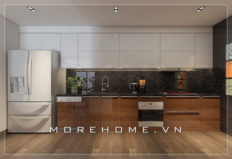 Mẫu tủ bếp gỗ công nghiệp hiện đại cho phòng bếp chung cư