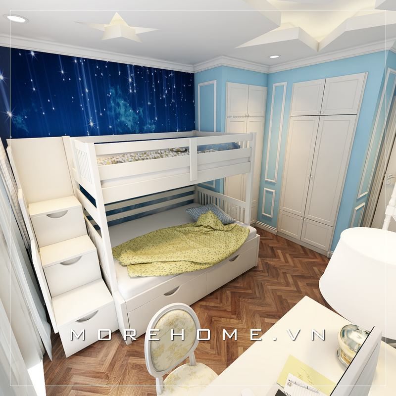 Mẫu giường ngủ gỗ tự nhiên phun sơn trắng tinh tế là sự gợi ý hoàn hảo dành cho phòng ngủ của 2 bé trai nhà bạn
