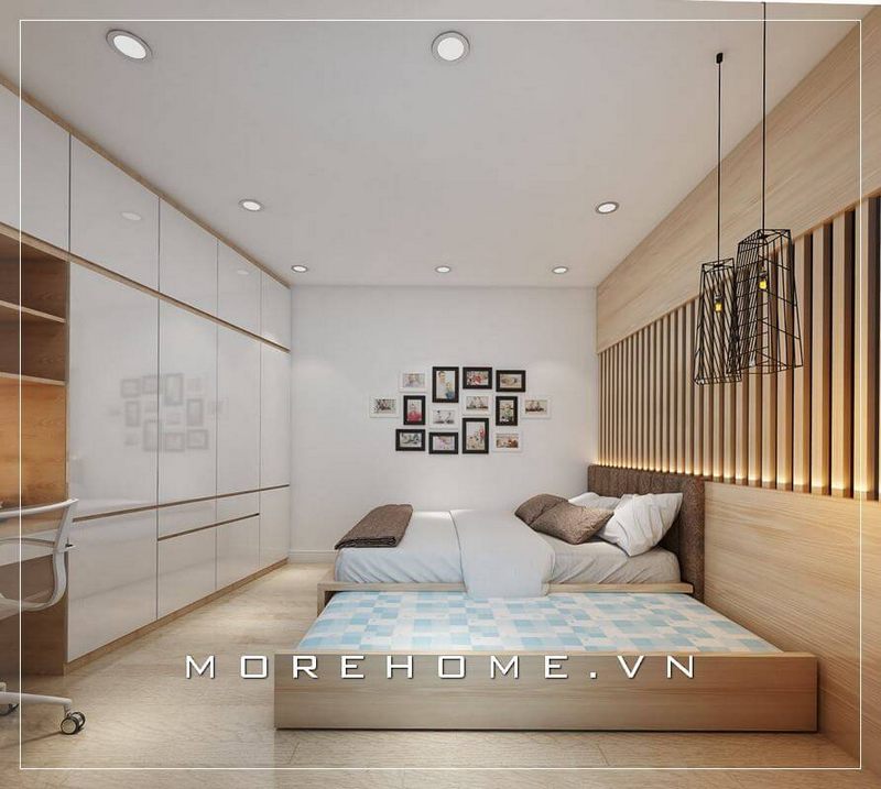 Giường ngủ gỗ công nghiệp có thiết kế thấp, phần đầu giường có độ cách điệu, mang lại cảm giác rộng rãi và thoải mái nhất cho người sử dụng.