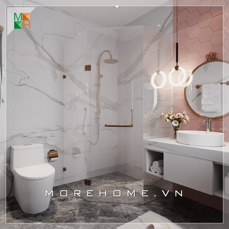 Vách tắm kính 135 độ để phân chia riêng khu tắm đứng, giới hạn tối đa lượng nước bốc ra ngoài, tiện lợi vệ sinh và an toàn, cũng như tối ưu hóa thẩm mỹ không gian sử dụng.