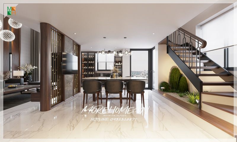 Bên cạnh đó, việc kết hợp ánh sáng tự nhiên cũng là yếu tố quan trọng không kém. Một cửa sổ lớn hoặc cửa kính sẽ cho phép ánh sáng tràn ngập vào phòng, làm nổi bật màu sắc của những món ăn và tạo cảm giác rộng rãi hơn. Khi bạn kết hợp cây xanh với ánh sáng tự nhiên, không gian phòng ăn không chỉ trở nên hiện đại mà còn mang lại cảm giác ấm cúng và thân thiện, lý tưởng cho những bữa tiệc gia đình hay những buổi gặp gỡ bạn bè.