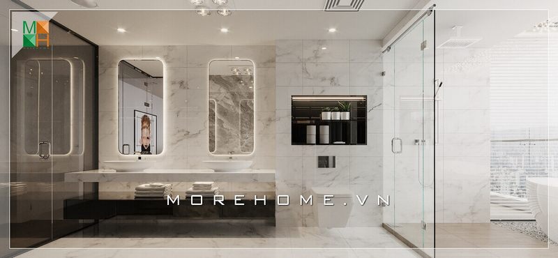 Mẫu thiết kế nội thất phòng tắm hiện đại được sử dụng chủ yếu tone màu trắng để tạo nên sự sang trọng và tinh tế cho các không gian nhà phố, biệt thự, chung cư.